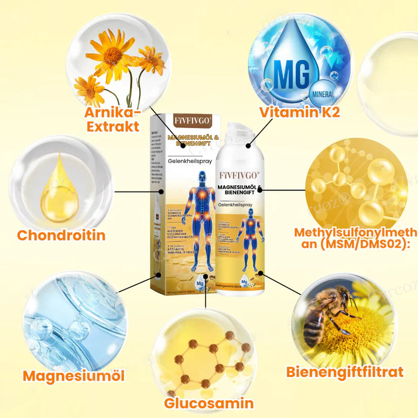 Naturally support long-term joint strength and bone health. The synergistic action of magnesium oil and bee venom not only relieves pain but also strengthens your joints and bones over time. Bee venom improves local circulation and promotes tissue repair, while magnesium supports healthy bone mineralization and density. Together, they contribute to the protection against joint degeneration, improve overall musculoskeletal health, and reduce the risk of osteoporosis—making Fivfivgo® an ideal long-term companion for anyone seeking lasting relief and stronger joints.